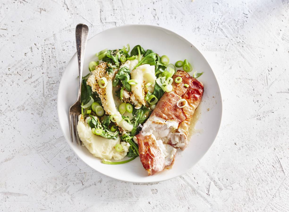 Snijd de vis in 4 gelijke stukken. Besmeer rondom met de roomkaas en wikkel elk stuk in 2 plakken ham. Verhit 1 el olie in een koekenpan en bak de vispakketjes in 8 min. op middelhoog vuur goudbruin en gaar. Keer regelmatig. Verwarm ondertussen de aardappelpuree volgens de aanwijzingen op de verpakking in de magnetron.