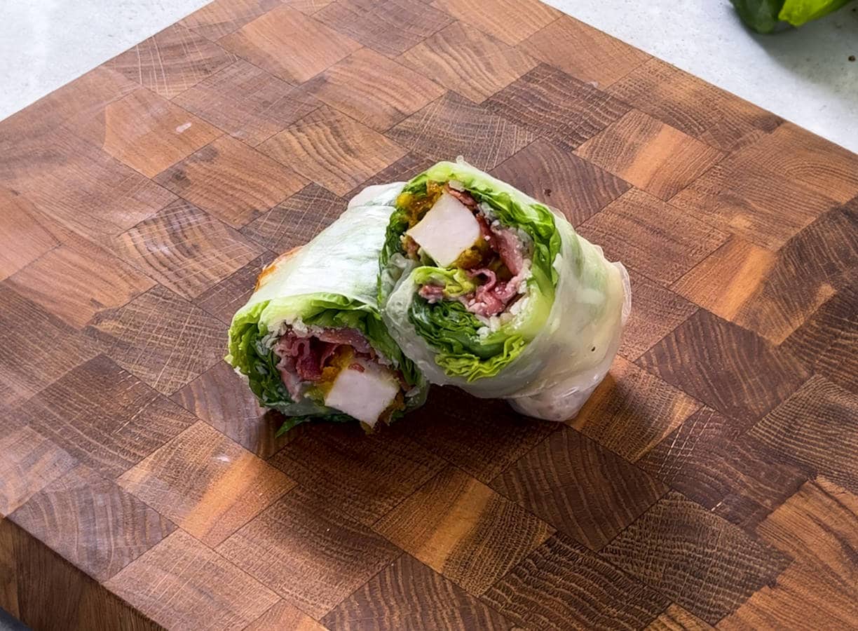 Vouw de boven- en onderkant van de rijstvellen over de vulling. Vouw een van de zijkanten naar binnen en rol strak op. Halveer de wrap en serveer met de rest van de caesardressing.