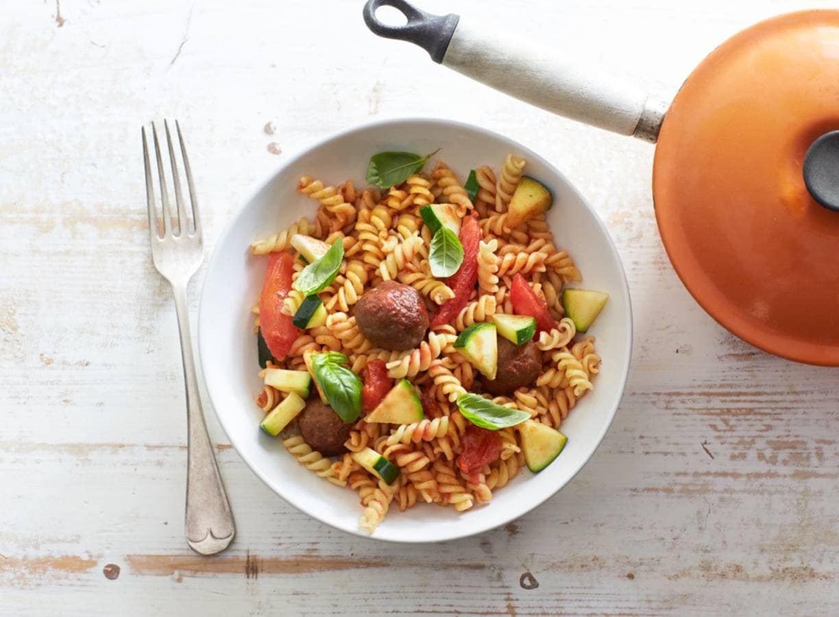 Snijd ondertussen de courgettes in lange repen en vervolgens in stukjes. Voeg met de pesto toe aan de balletjes en bak al omscheppend 3 min. op middelhoog vuur. Voeg de tomaten toe en warm 4 min. mee. Plet de tomaten ondertussen met een lepel en meng met de pasta.