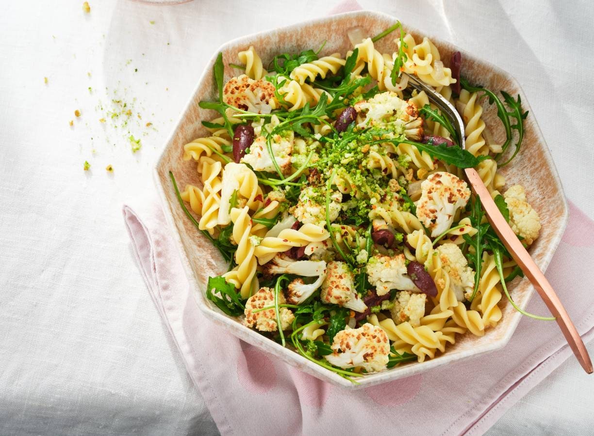 Op deze pasta met geroosterde bloemkool strooi je knapperige pangrattato, wat 'broodkruim' in 't Italiaans betekent.