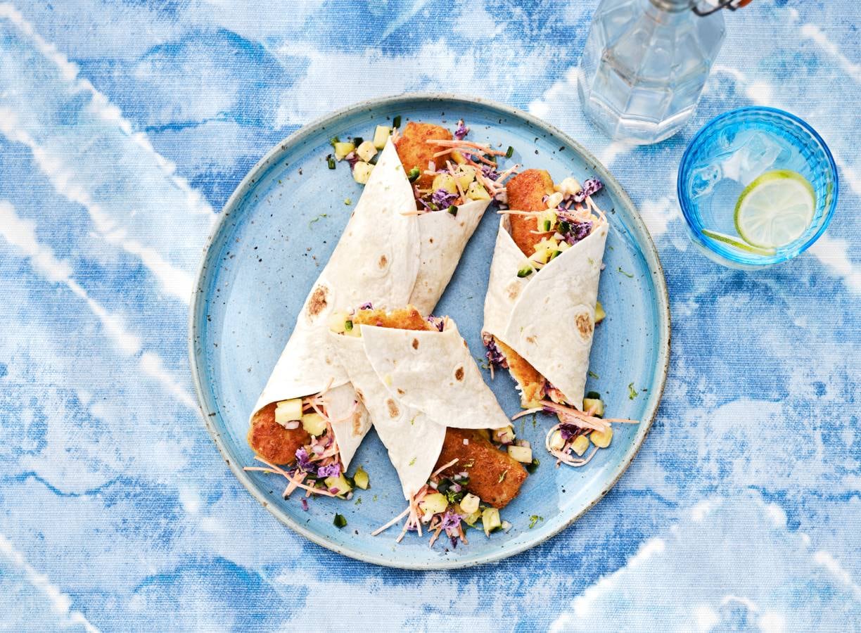 Verwarm de tortilla’s volgens de aanwijzingen op de verpakking. Beleg elke tortilla met kool-maissalade, vissticks en ananassalsa. Rol op en snijd schuin doormidden.