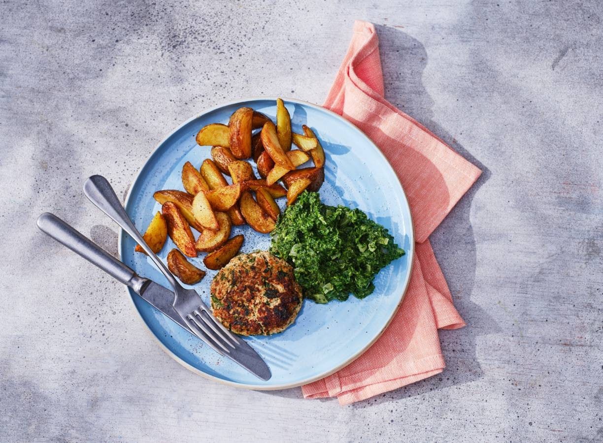 Een simpele maaltijd voor iedere dag van de week? Kies voor deze kipburger met gebakken aardappelen en romige spinazie.