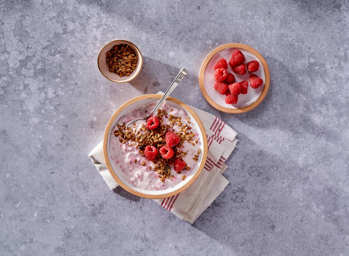 Bestrooi met de ontbijtgranen en de rest van de frambozen.