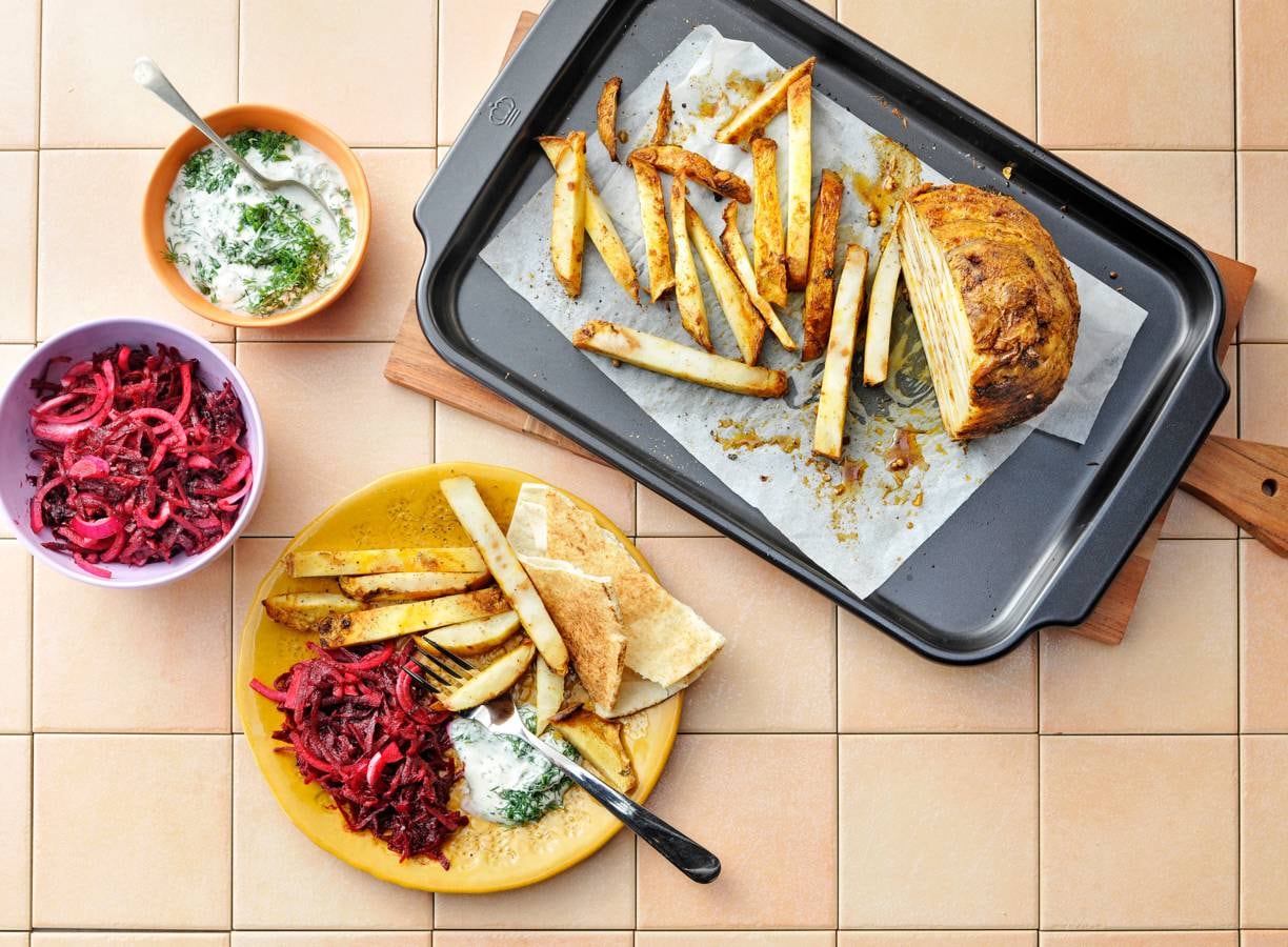 Knolselderij ‘shoarma’ met platbrood en bietensalade