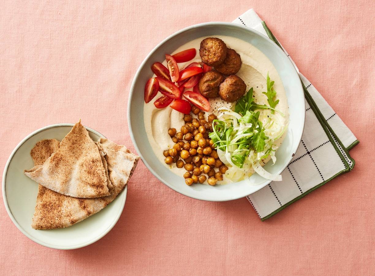 Haal de bakplaat uit de oven. Verdeel de hummus over kommen en strijk glad. Verdeel de geroosterde kikkererwten, snoeptomaten, venkelsalade en falafel naast elkaar over de hummus.