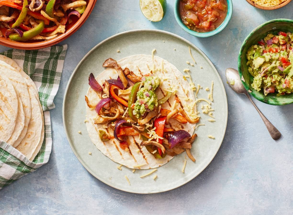 Vegan fajitas met koningsoesterzwam en tortilla's