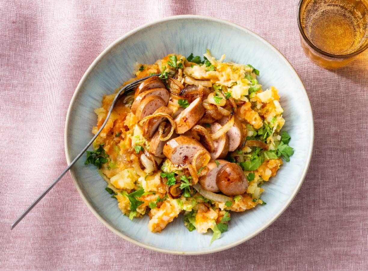 Andijviestamppot met zoete aardappelen en peterselie: daar krijgt-ie extra smaak en kleur van. Nog een vegetarische rookworst erbij... Klassieker in een nieuw jasje!