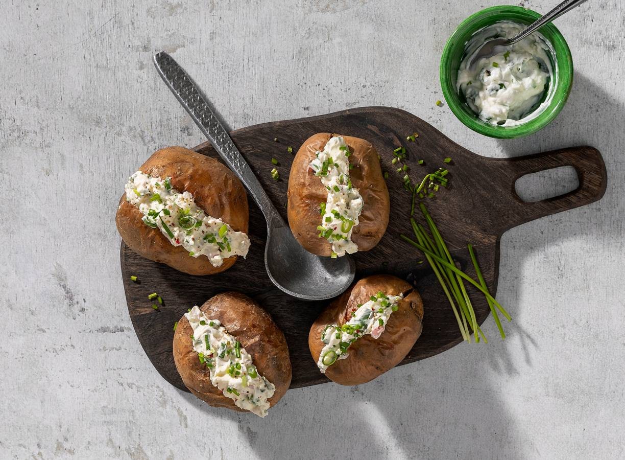 Je airfryer is niet alleen voor het bakken van frietjes! Je kunt er ook heerlijke gepofte aardappelen mee maken. Perfect met roomkaas als vulling.