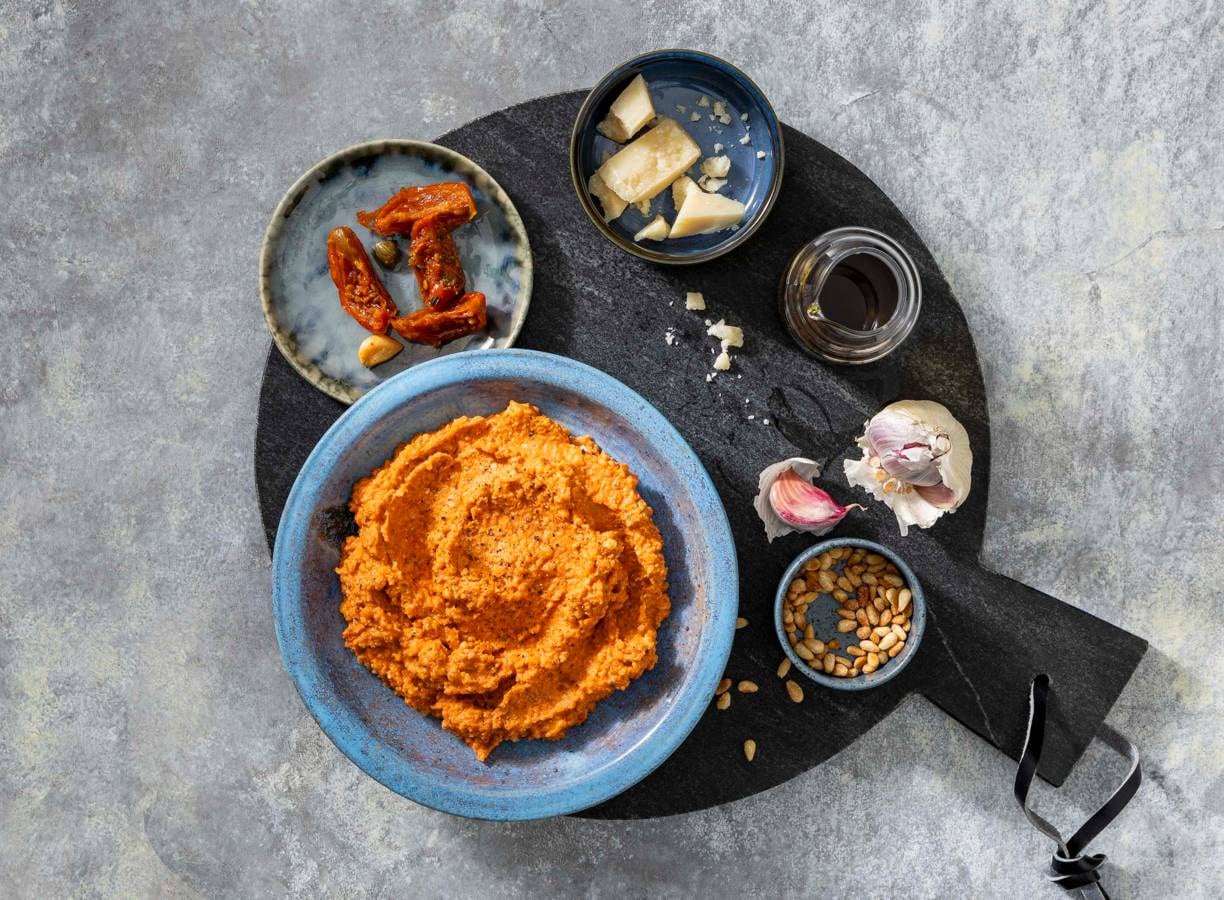 Groene pesto is een vertrouwde bekende. Wist je dat je ook een rode pesto kunt maken? Je gebruikt dan zongedroogde tomaten in plaats van basilicum. Leuk om eens af te wisselen en verrassend makkelijk te maken. Met deze rode pesto kom je de week wel door!