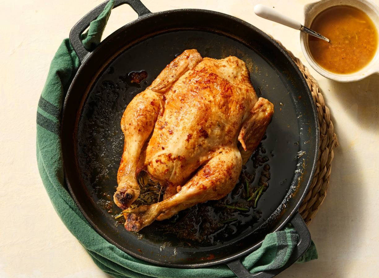 Verwarm de oven voor op 150 °C. Zet de gietijzeren pan met de kip in de oven en rooster de kip in ca. 1 uur gaar tot het de kerntemperatuur 78 °C bereikt. Bedruip de kip om de 15 min. met braadvet.