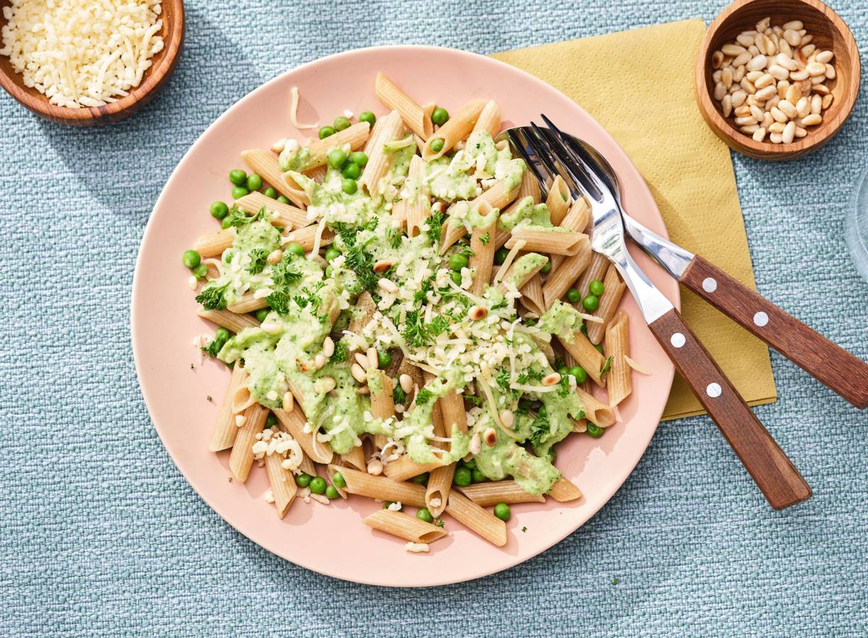 Voeg de zuivelspread toe en pureer het geheel met de staafmixer. Breng op smaak met peper. Verdeel de pasta met de erwten over de borden en schenk de groene-groentensaus erover. Bestrooi met de kaas, peterselie en pijnboompitten en serveer direct.