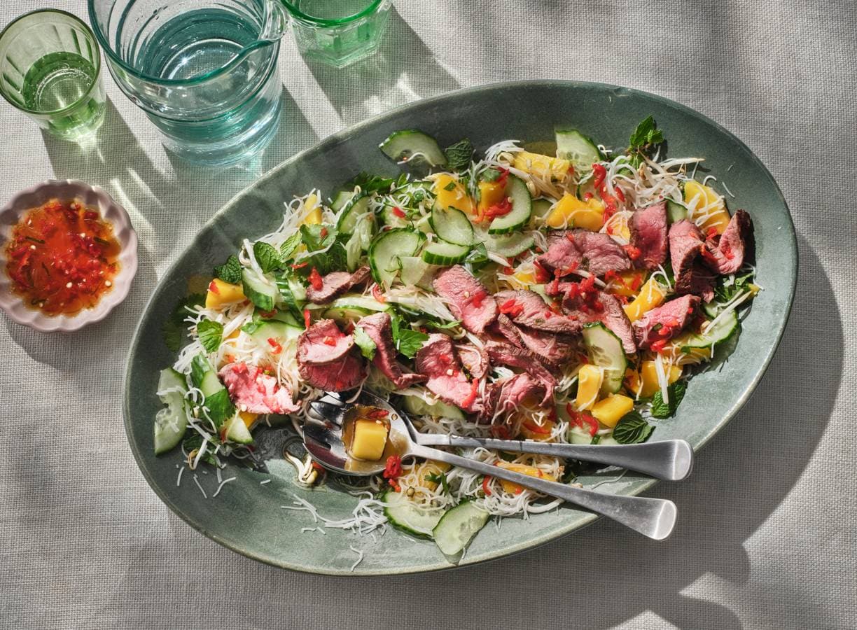 Deze friszoete Thaise beef salad wordt jouw favoriet voor de lente en zomer. Mals rundvlees, zoete mango, knapperige komkommer – wat wil je nog meer?