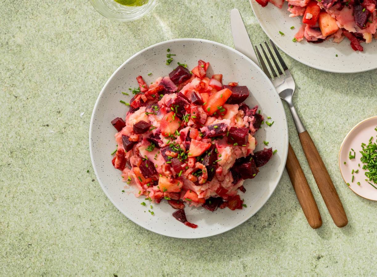 Schep ⅔ van het bietenmengsel erdoor. Schep op borden en verdeel de rest van het bietenmengsel erover.