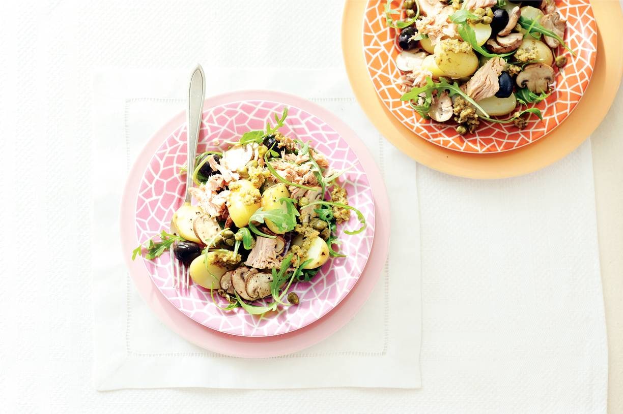 Giet de tonijn af en vang de olie op. Meng de tonijnolie met de tapenade. Meng de tonijn met de krieltjes, champignons, olijven en kappertjes.