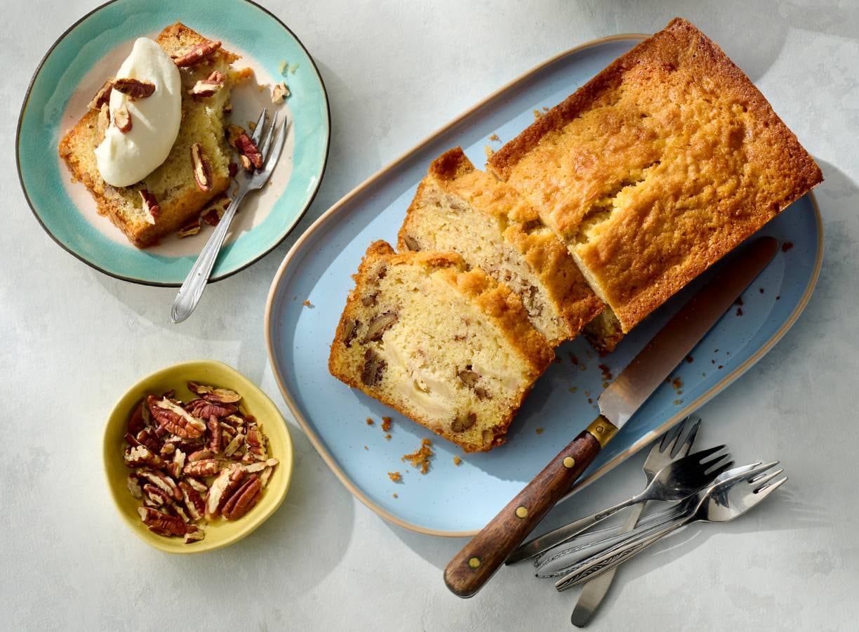 Klop de slagroom lobbig. Snijd de cake in dikke plakken. Serveer de cake met slagroom en bestrooi met de rest van de pecannoten.