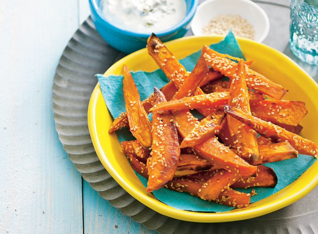 Verwarm de oven voor op 200 ºC. Schil de zoete aardappelen en snijd ze in de lengte in dikke frieten. Verdeel ze over een met bakpapier beklede bakplaat. Snijd de knoflook fijn. Meng de olie en knoflook in een kom en besprenkel de frieten ermee. Bestrooi met 1 el sesamzaad en zout en bak in de oven in ca. 45 min. goudbruin en gaar. Keer na 25 min. en bestrooi met de rest van het sesamzaad.