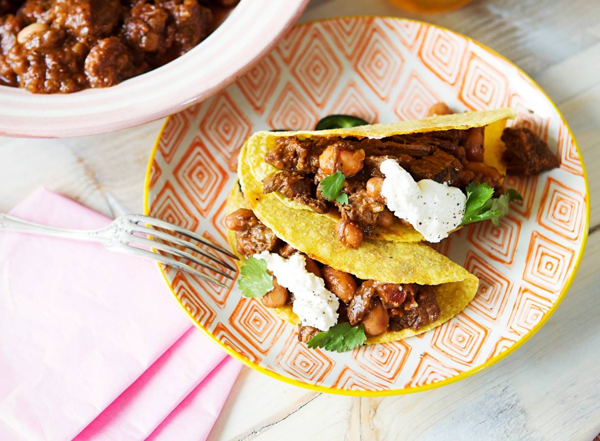 Neem de pan uit de oven en trek met 2 vorken het vlees uit elkaar tot draadjes. Laat de bonen uitlekken en voeg toe aan het vlees. Warm op laag vuur nog 10 min. door. Bereid ondertussen de tacoschelpen volgens de aanwijzingen op de verpakking. Serveer het stoofvlees met de taco’s.