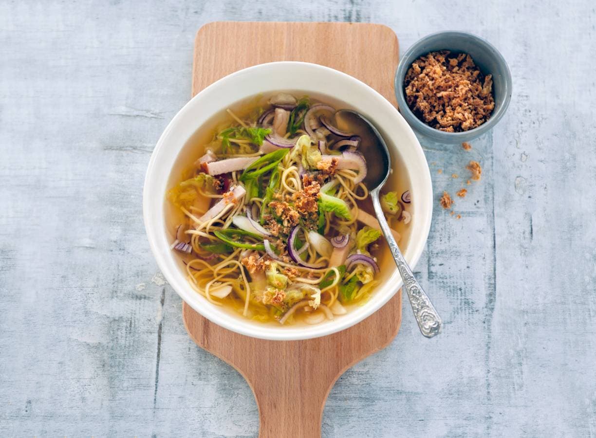 Verdeel de mie over de kommen. Snijd de bosuitjes in ringetjes en verdeel met de kip over de kommen. Breng de soep op smaak met de sojasaus en schep in de kommen.