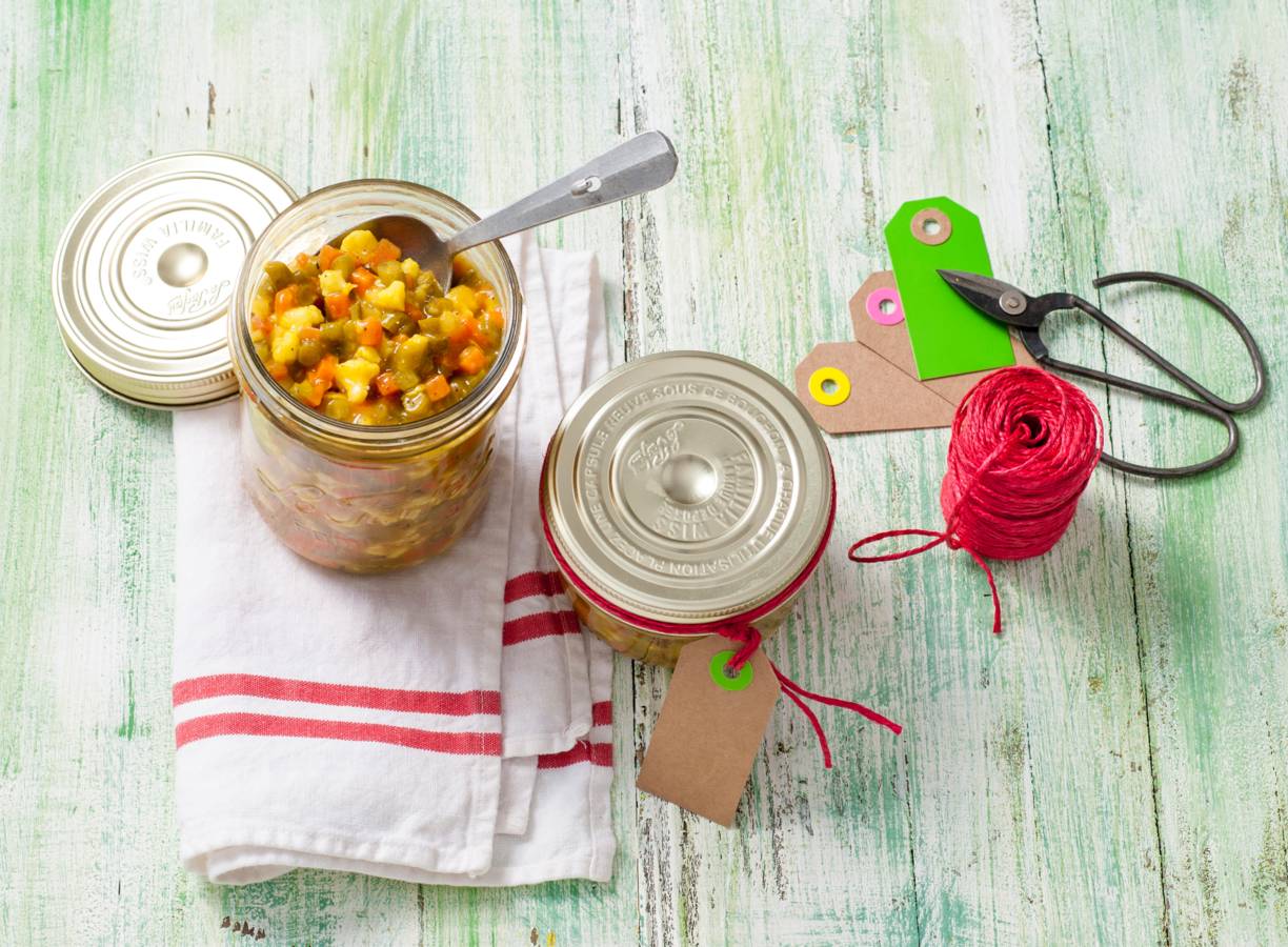 Breng de piccalilly op smaak met peper en eventueel zout. Vul de pot met piccalilly. Sluit direct af en laat omgekeerd afkoelen. Hang een kaartje met naam, maand en jaartal aan de pot.