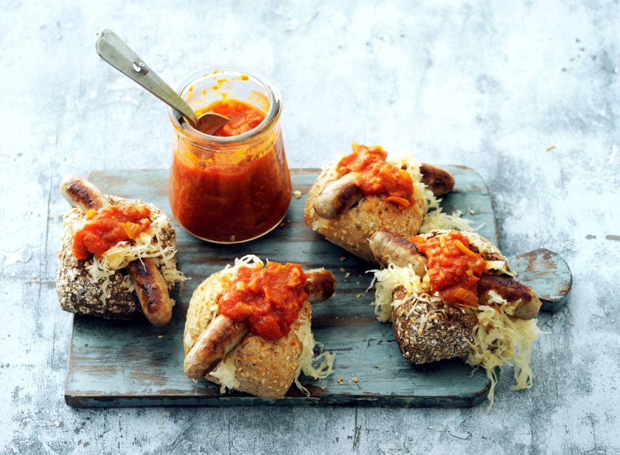 Sandwich met curryworst en zuurkool