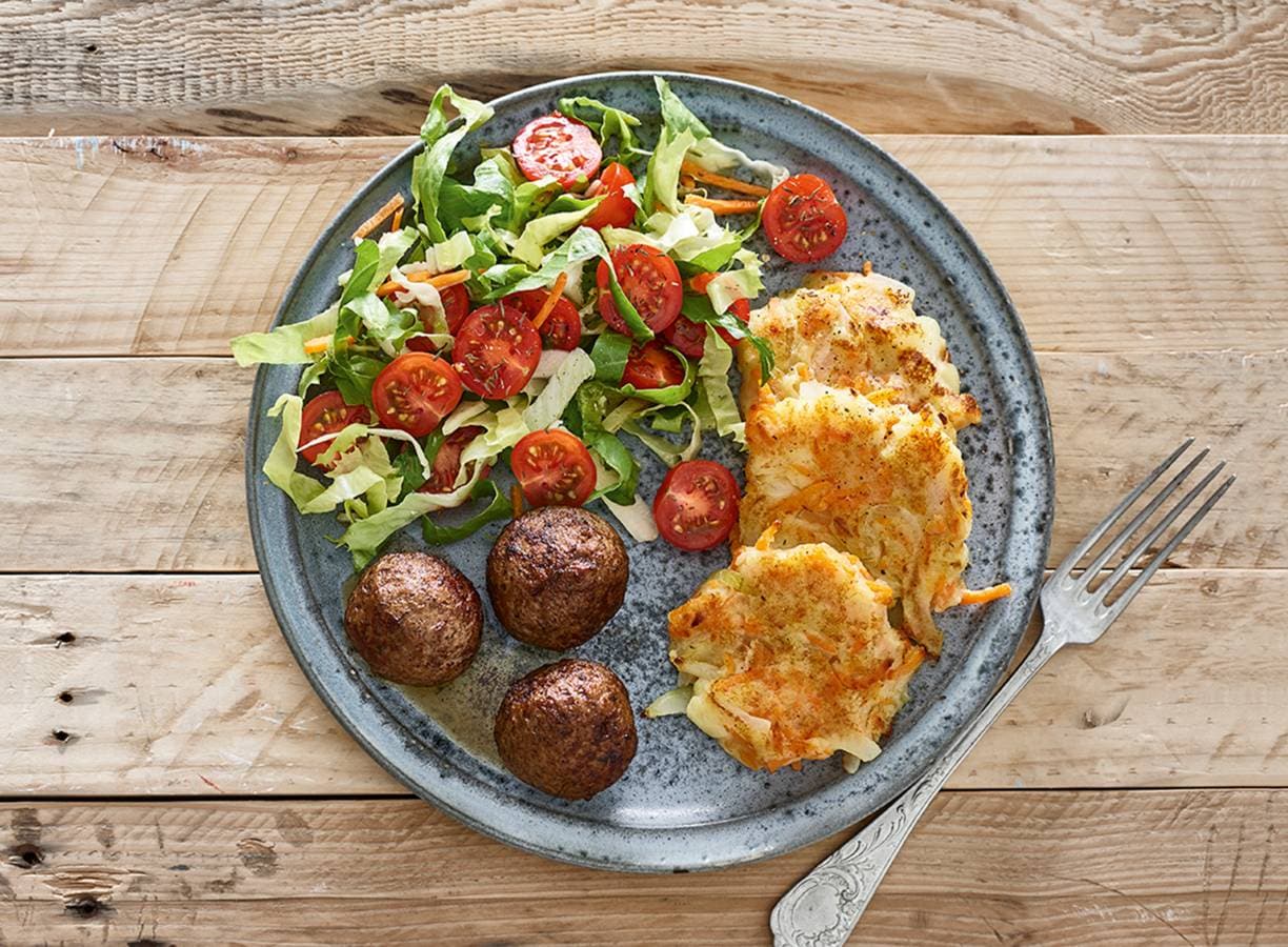 Serveer de gehaktballetjes met de hutspotkoekjes en de salade.