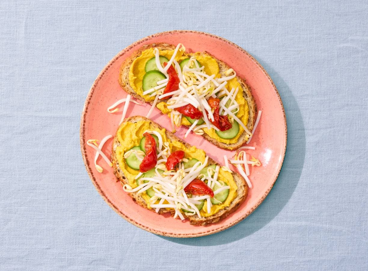 Besmeer de sneetjes brood met de pompoenhummus. Beleg de helft van de sneetjes brood met de komkommerplakjes, zongedroogde tomaten en taugé. Breng op smaak met peper en eventueel zout en dek af met de rest van de sneetjes. Snijd de sandwiches eventueel schuin door en serveer.