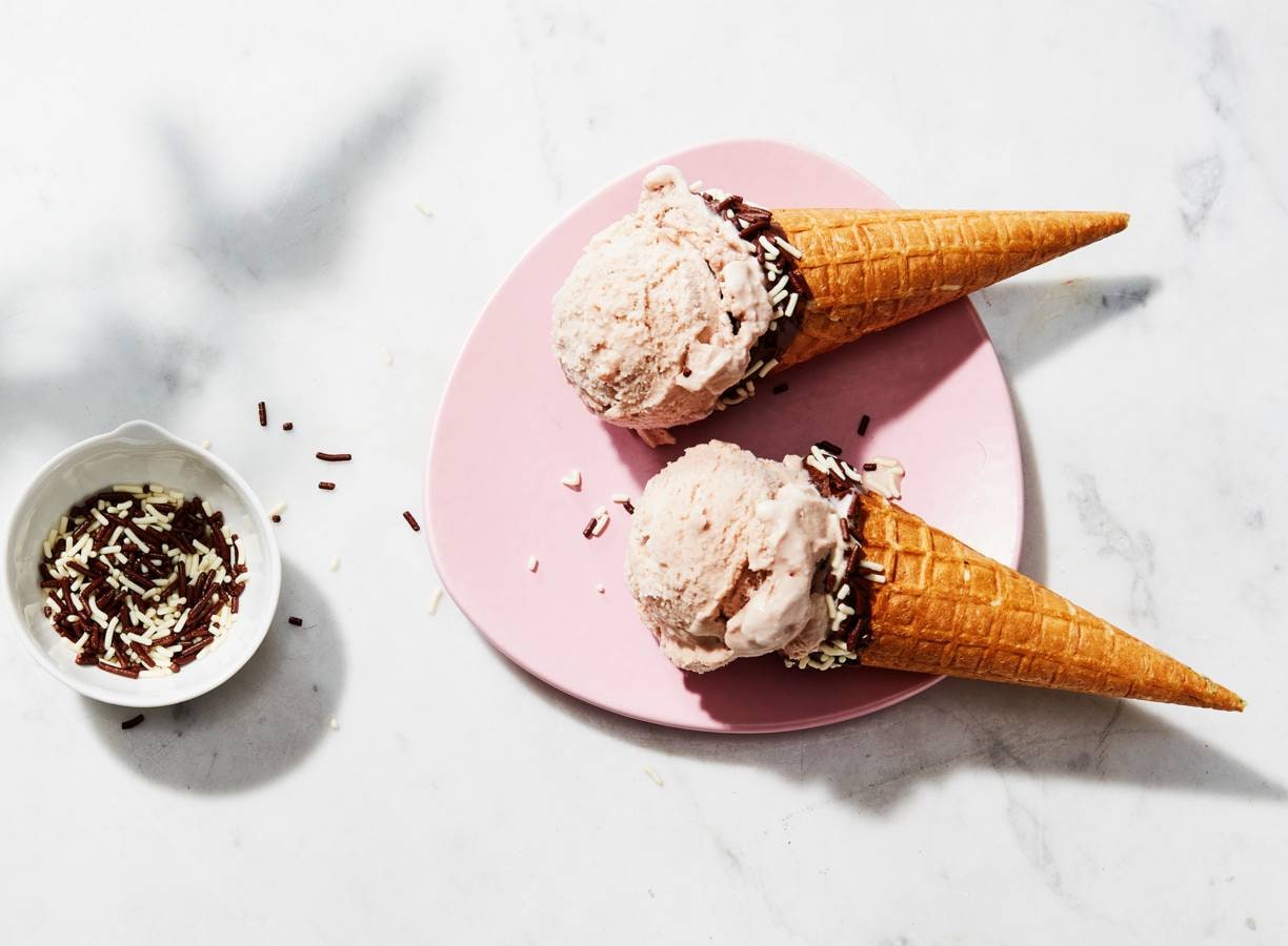 Schep met de ijslepel op elk ijshoorntje twee flinke bollen chocolade-ijs.