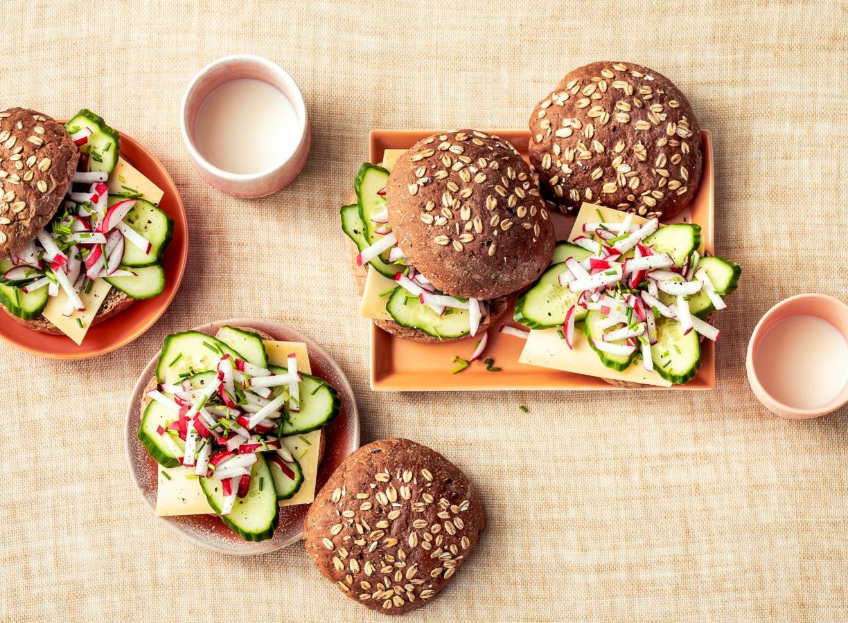 Volkorenbolletje met kaas, radijs en komkommer