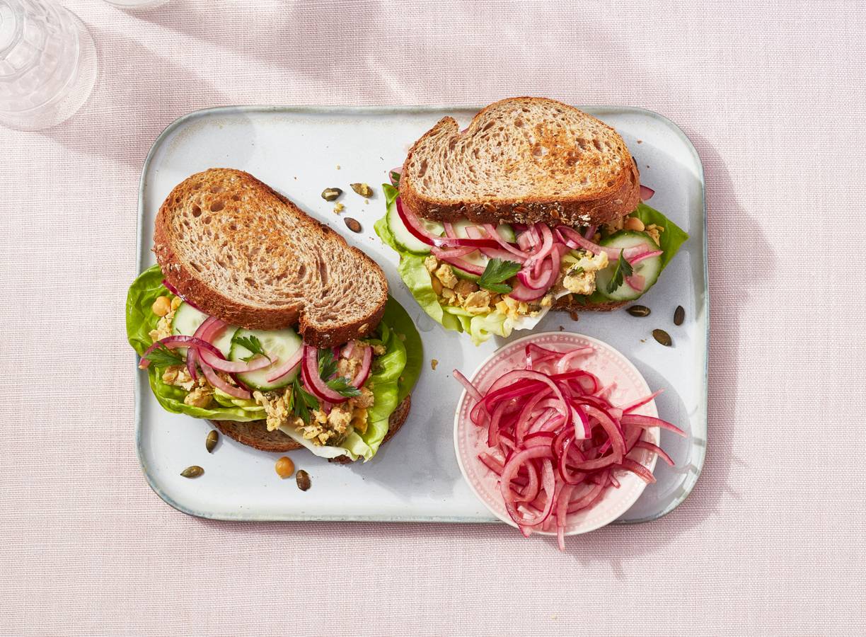 Met de snelle ingelegde rode ui en zelfgemaakte kikkererwtenspread barst deze sandwich van de smaken!