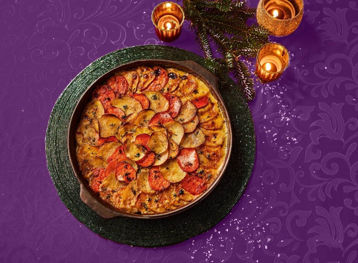 Aardappelgratin met twee kleuren aardappel