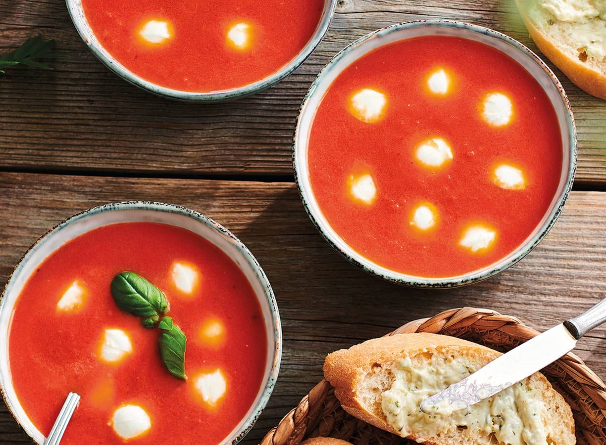 Schep de soep in kommen en verdeel de mini-mozzarellabolletjes (met de bolle kant naar boven) als witte stippen over de rode soep. Serveer met de sneetjes ciabatta met heksenkaas.