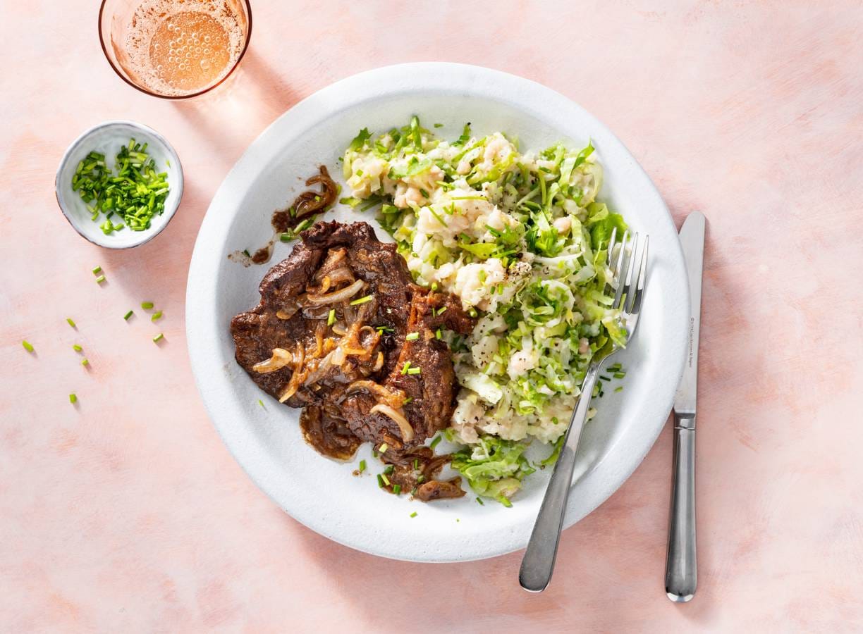 Lekker koolhydraatarm, deze knolselderijstamppot met boterzacht gestoofde sukadelappen.