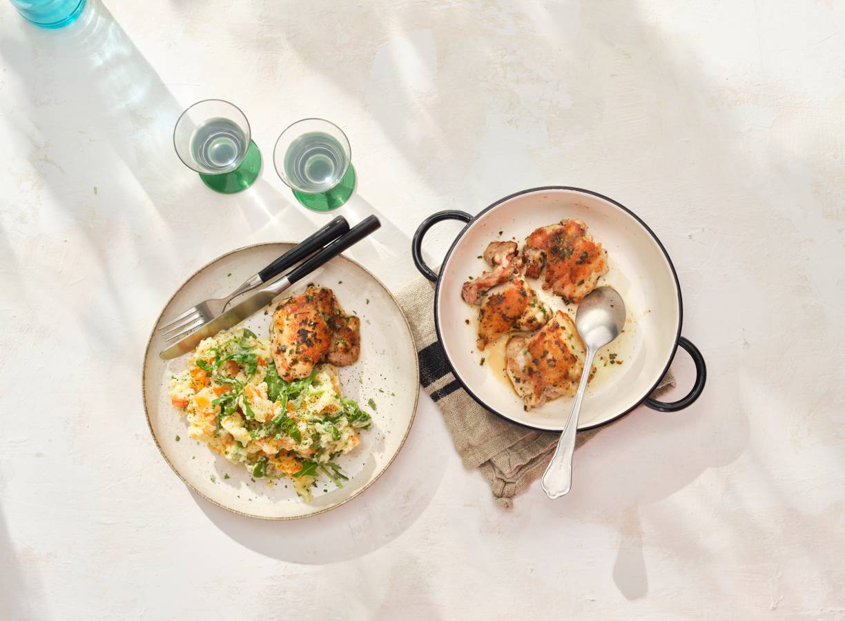 Verdeel de pompoenstamppot over borden en verdeel de kip erover.
