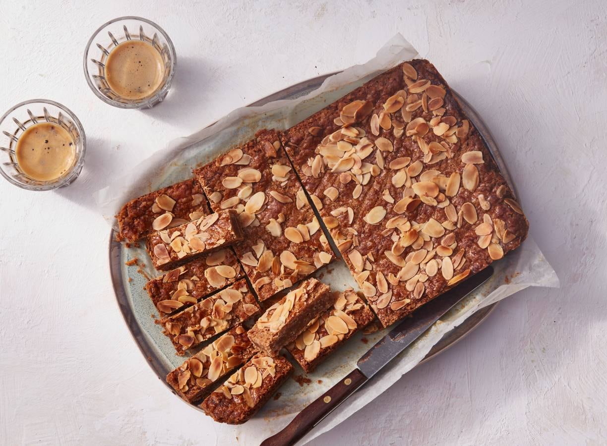 Bak de boterkoek in ca. 30 min. goudbruin. Laat minimaal 4 uur (liever langer) afkoelen en snijd in stukjes.