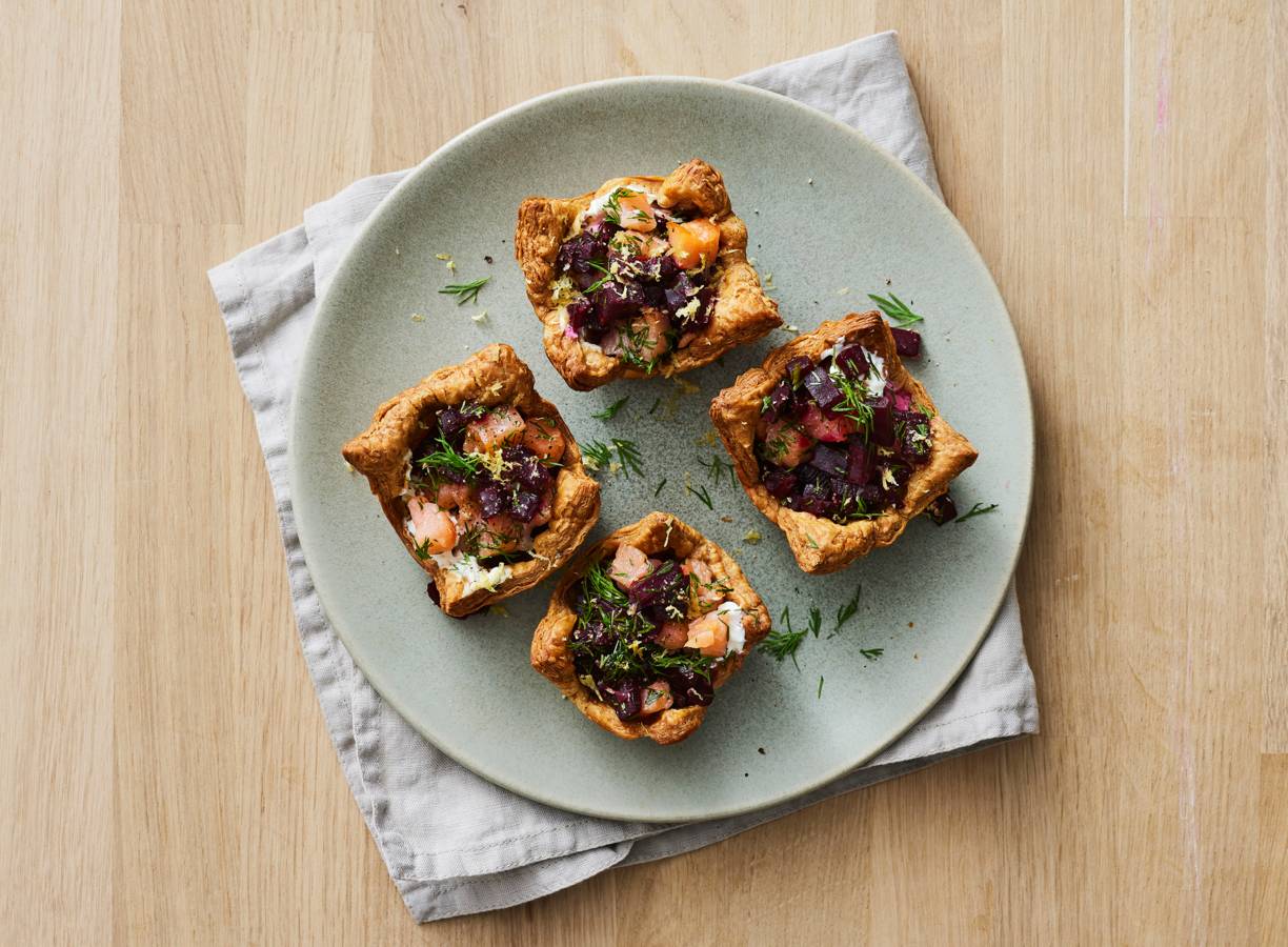 Bladerdeeghapjes met zalm- en rodebietvulling