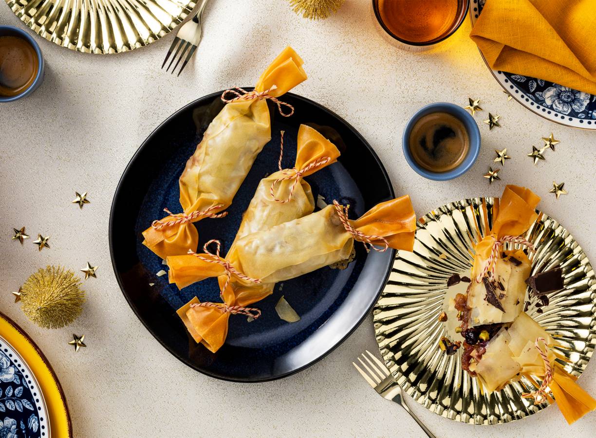 Halveer de rest van de plakken filodeeg en bestrijk elke helft met wat gesmolten plantaardige boter. Verdeel de gevulde pakketjes erover en rol het deeg vanaf de lange zijde op. Vorm een christmas cracker door beide uiteinden van het deeg aan elkaar te knijpen. Bind de uiteinden vast met stukjes keukentouw.