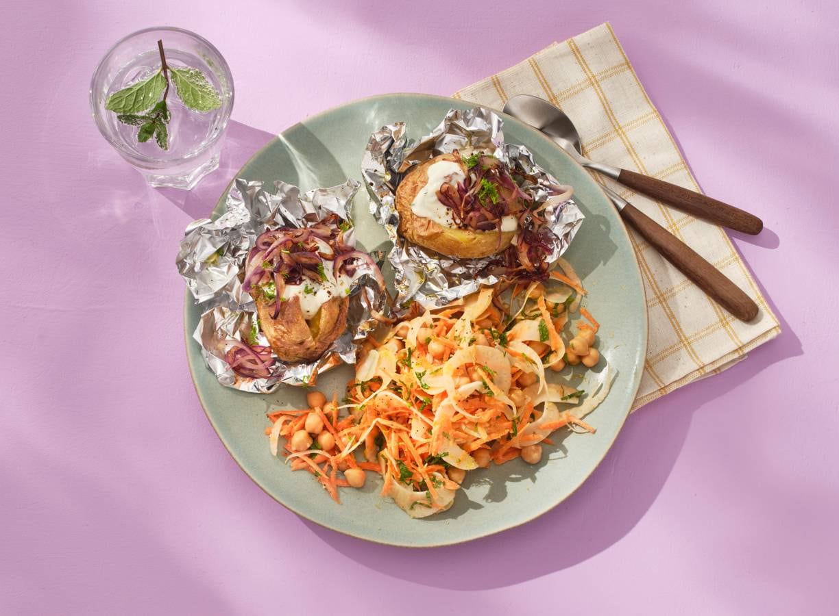 Haal de aardappelen uit de oven, verdeel over de borden en open de bovenkant. Snijd de aardappelen in de lengte in. Schep de rest van de muntyoghurt erop en, verdeel de gebakken uien erover en breng op smaak met peper. Verdeel de salade erbij en bestrooi met het venkelgroen.