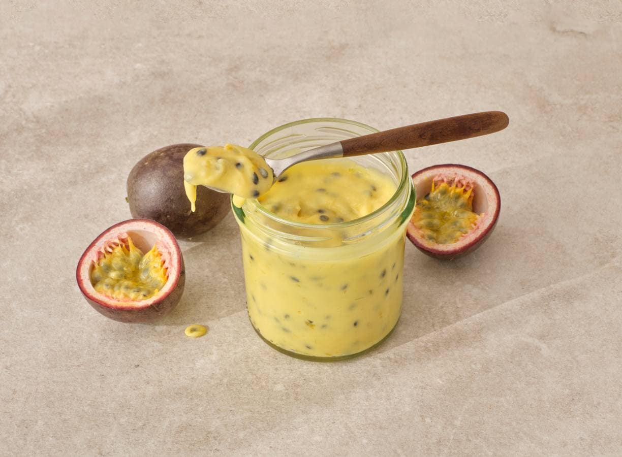 Het is fris, het is zoet en een tikkeltje zurig: passievruchtcurd! Perfect als taarttopping, voor in de yoghurt of om gewoon zo van te snoepen. Je maakt het met limoen, ei en... passievrucht.