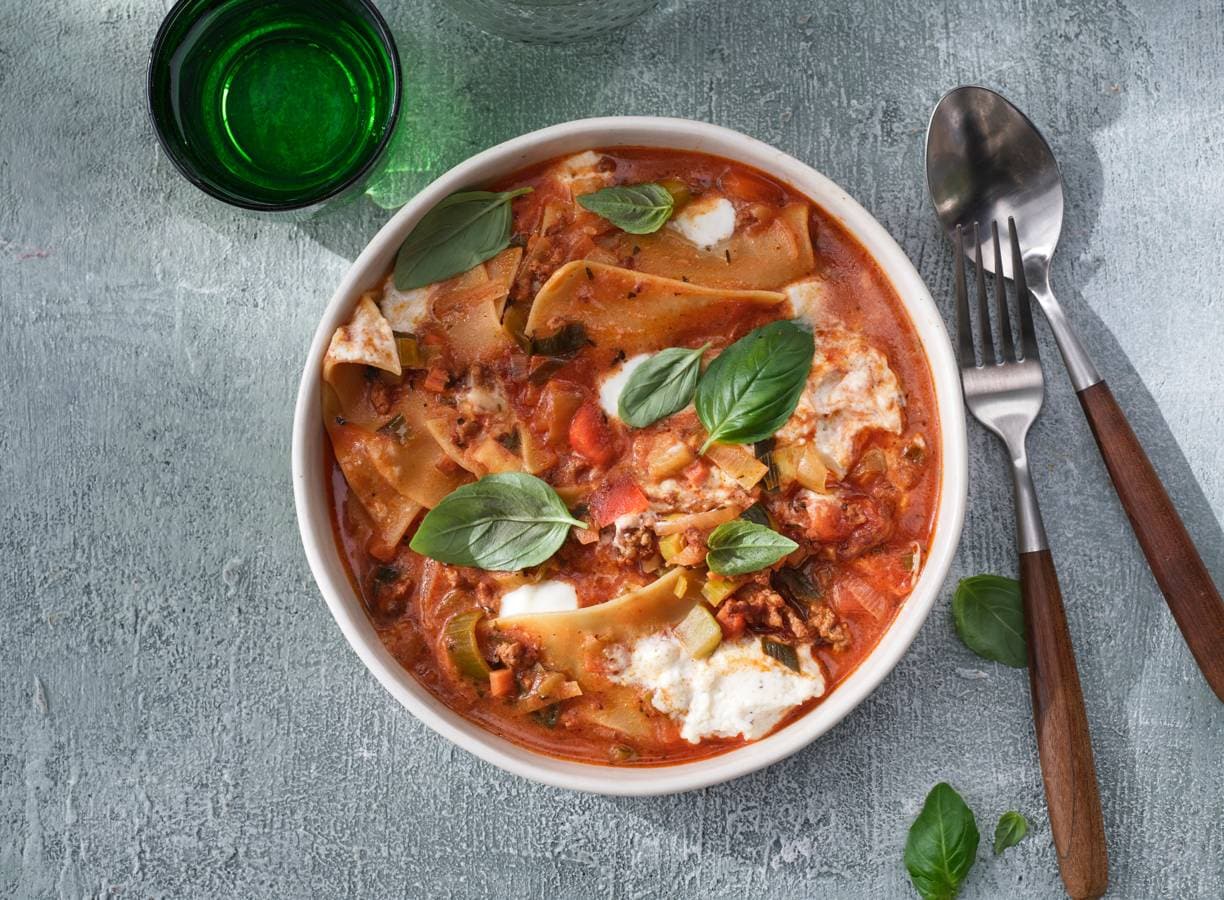Gek op lasagne? Probeer deze lasagne-soep eens. Al het lekkere van een klassieke lasagne en een stuk sneller op tafel!