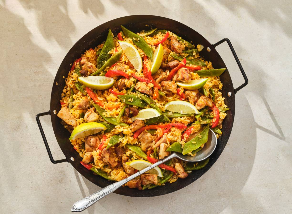 Haal Spanje even naar hier met deze paella met kip en snijbonen. Door de saffraan en paprikapoeder wordt het gerecht een kleurrijk geheel. Eet smakelijk!
