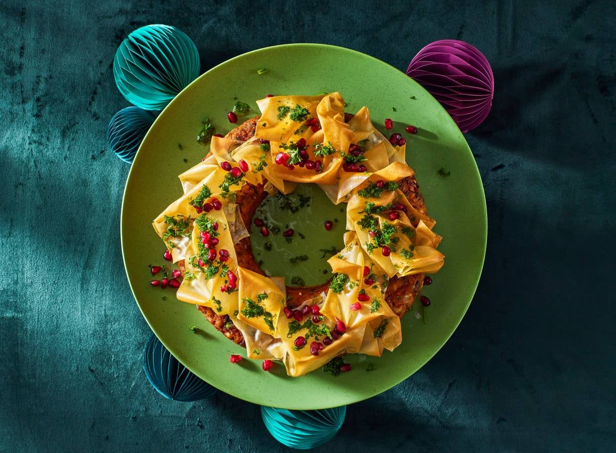 Haal de krans uit de oven en zet de oven op 170 °C. Leg een stuk bakpapier op de krans, vervolgens een bord erop. Keer om en schuif de krans met behulp van het bakpapier op de bakplaat. Drapeer de plakken filodeeg losjes in en luchtig op de krans en bak nog 10 min. in de oven.