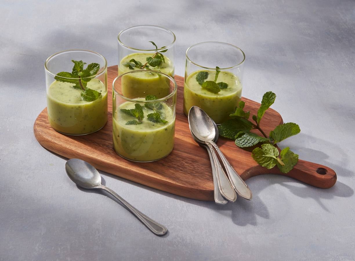 Een frisse soep met komkommer en munt. Zo klaar, maar het moet nog wel even afkoelen.