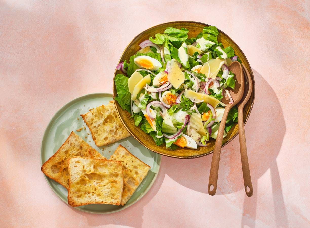Schaaf grote krullen van de kaas. Meng de andijvie, ui en dressing in een kom. Verdeel over 4 borden en garneer met het ei en de kaas. Serveer met het brood.