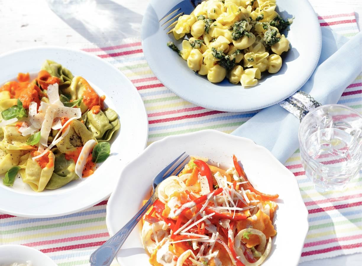 - variatietipTortelloni bicolore. Kook 2 pakken tortelloni bicolore (pasta, à 250 g, koelvers) beetgaar volgens de aanwijzingen op de verpakking. Verwarm ondertussen 2 bakjes tomaat-mascarponesaus (à 225 g, koelvers) volgens de aanwijzingen op de verpakking. Serveer de pasta met de saus en bestrooi met geraspte Parmezaanse kaas en de blaadjes van 1 bakje basilicum (15 g).