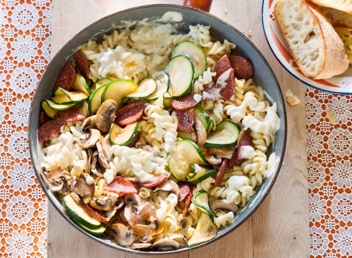 Giet de pasta af en schep met de roomkaas door de groenten en cervelaat. Warm nog 2 min. door en serveer.