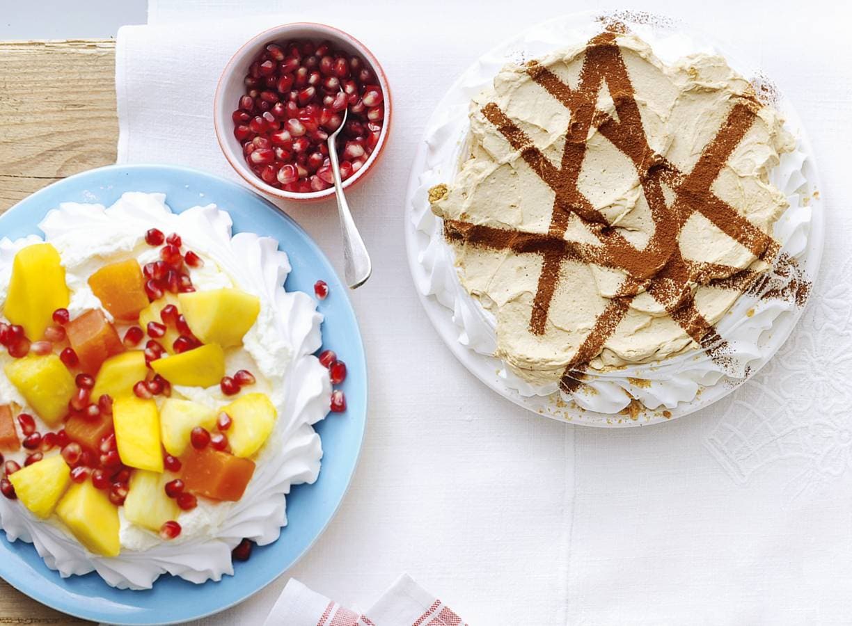 Klop de slagroom met de poedersuiker stijf. Meng de mascarpone en de espressopoeder erdoor. Verkruimel de digestive koekjes en verdeel over de bodem van de pavlova. Schep de koffiemascarpone erop.