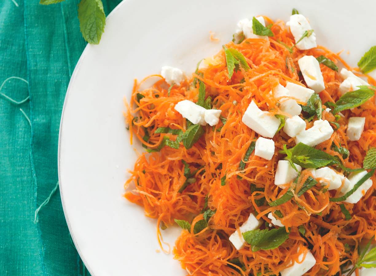 Snijd de witte kaas in blokjes en strooi deze over de wortelsalade.