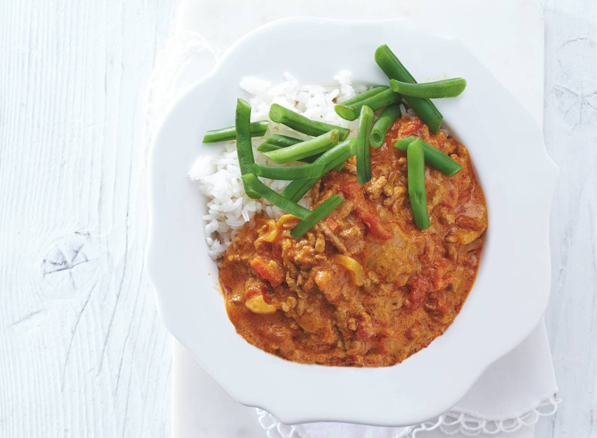 Schep de rijst in diepe borden en verdeel de gehaktkorma erover. Serveer met de sperziebonen.