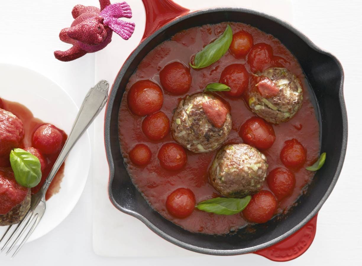 Gehaktballetjes met vanbinnen een verrassing. Gestoofd in tomaten-basilicumsaus.