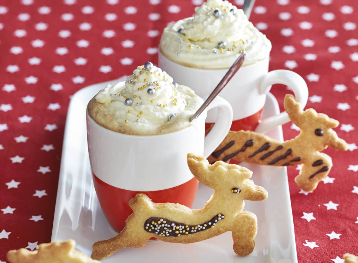 Schenk de chocolademelk in de bekers en roer door. Spuit er een flinke toef slagroom op en garneer met chococrisps, hagelpret of zachte zilveren parels.